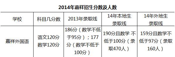 嘉祥作为私立学校,小升初可以组织学校的招生考试,和其他私立名校一样,嘉祥的小升初招考也分为本地生和外地生考试,时间一般在5月份。以下是2014年嘉祥本地生和外地生的招录人数和招录分数线,供参考。