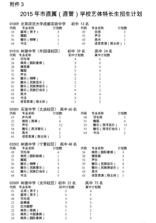 2015年成都市直属初中学校艺体特长生招生计划公布,各直属初中学校2015年小升初特长生招收专业、招生人数等详情如下,供2015成都小升初家长参考。