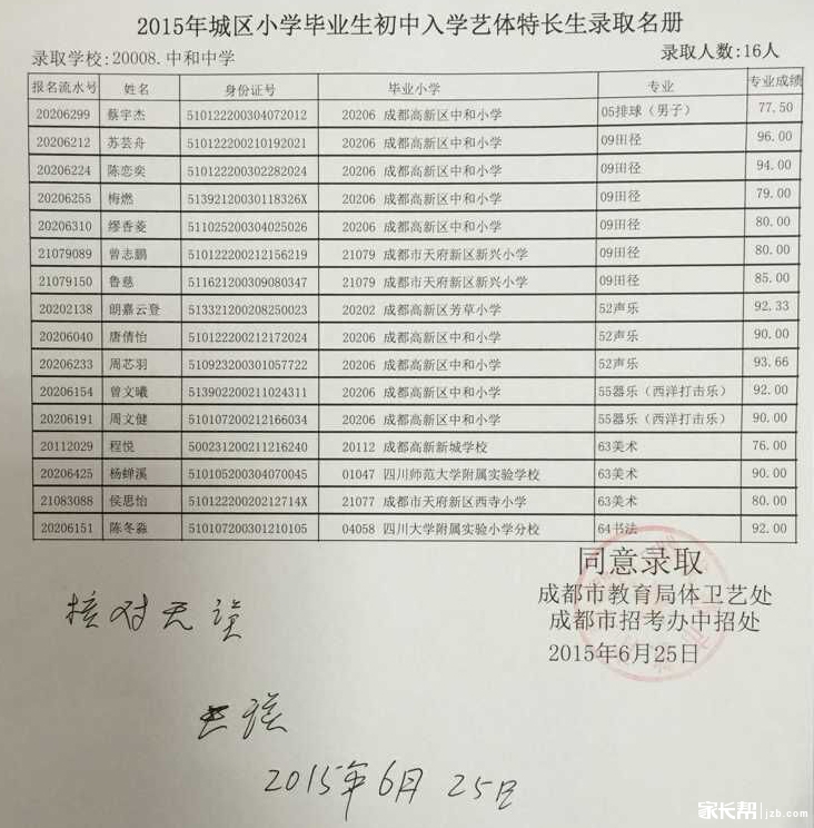 成都各公办初中2015小升初特长生录取名单今天(6月26日)公布了,下面是成都中和中学2015年小升初艺体特长生录取名单,供参考。