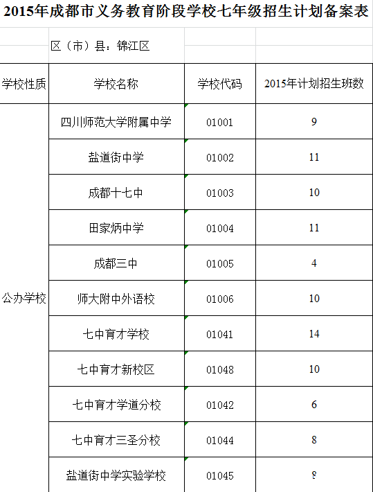 下面是2015年成都锦江区义务教育阶段学校七年级招生计划备案表。即成都锦江区初中2015小升初招生计划表,供参考。