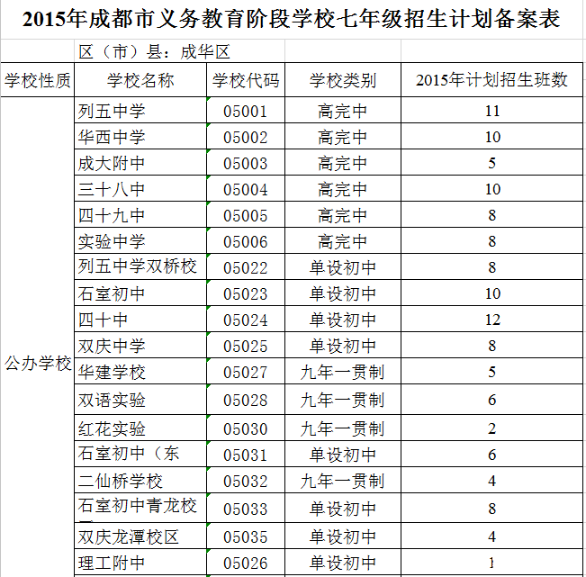 2015年成都市成华区义务教育阶段学校七年级招生计划备案表公布,成华区2015年招生情况如下。