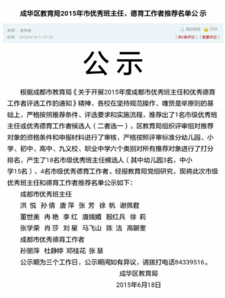 成都小升初择校,家长们不仅想要给孩子找个好学校,还希望孩子可以遇到一个好老师。下面是成都成华区2015年市优秀班主任、德育工作者推荐名单,供成都小升初择校家长参考。