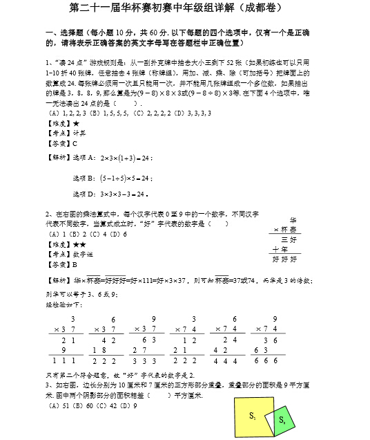 >>>点击下载完整版成都赛区第二十一届华杯赛初赛小中组真题答案