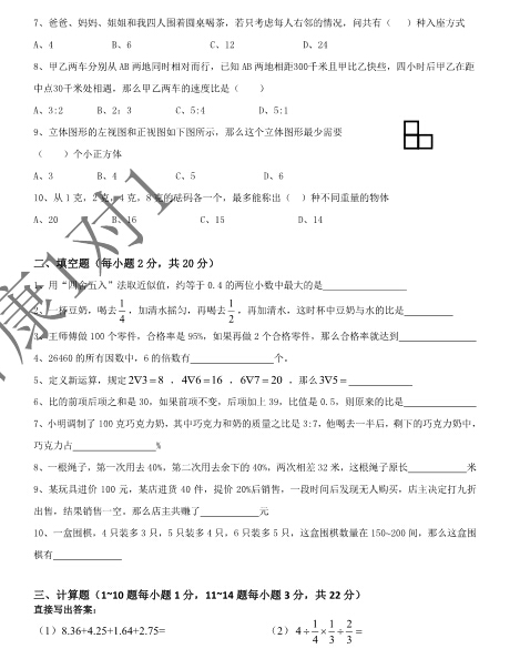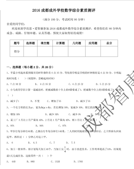 在元旦假期(1月3日)进行的成都外国语2016小升初综合素质测评考试结束了,下面小编将本次成都外国语小升初模拟考试的数学试卷及详解分享如下,供备战2016成都小升初择校的考生参考。