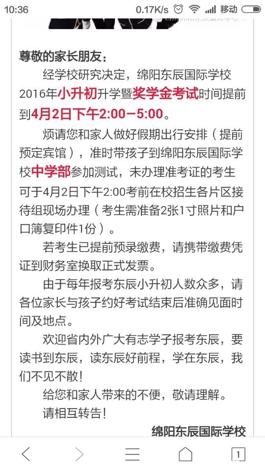 4月2日是四川绵阳地区2016小升初大考的日子,根据家长们分享的最新消息,绵阳东辰的小升初大考有原来的4月30日调至4月2日进行,同时南山实验的小升初考试也将在4月2日进行。