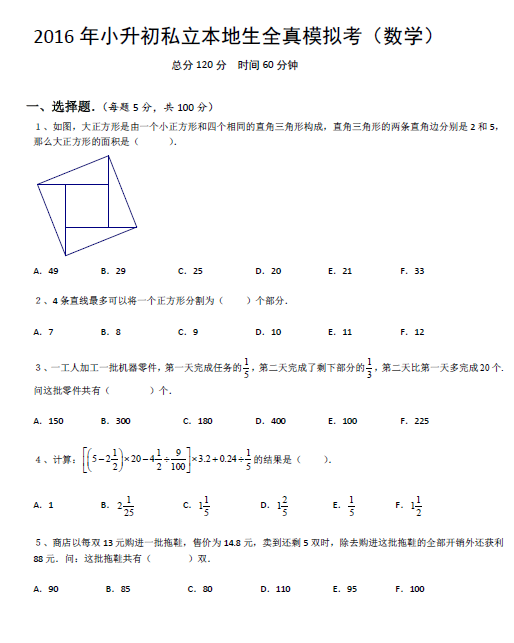 成都私立校2016小升初本地生模拟考试数学试卷及答案