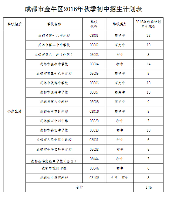 成都市金牛区2016年秋季初中(小升初)招生计划表公布,下面是成都金牛区各公办初中2016年小升初招生计划,供参考。