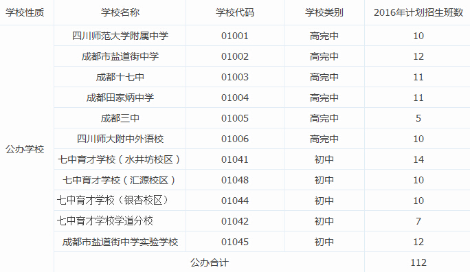 成都锦江区七年级2016小升初招生计划表
