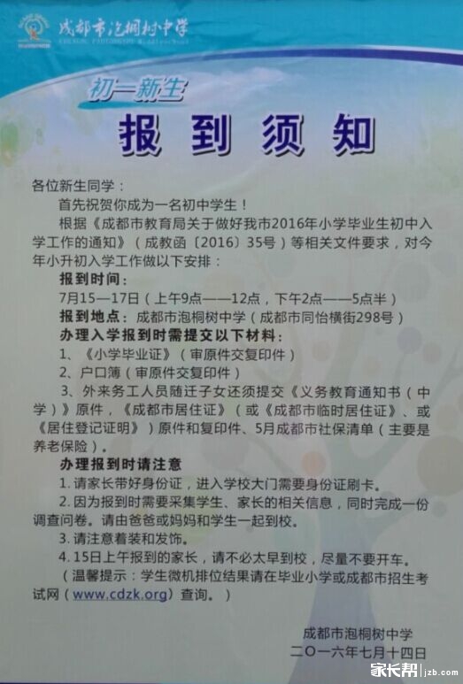 成都泡桐树中学2016年初一(小升初)新生报到将于7月15-17日进行,下面是成都泡桐树中学2016年小升初新生报到须知,供参考。