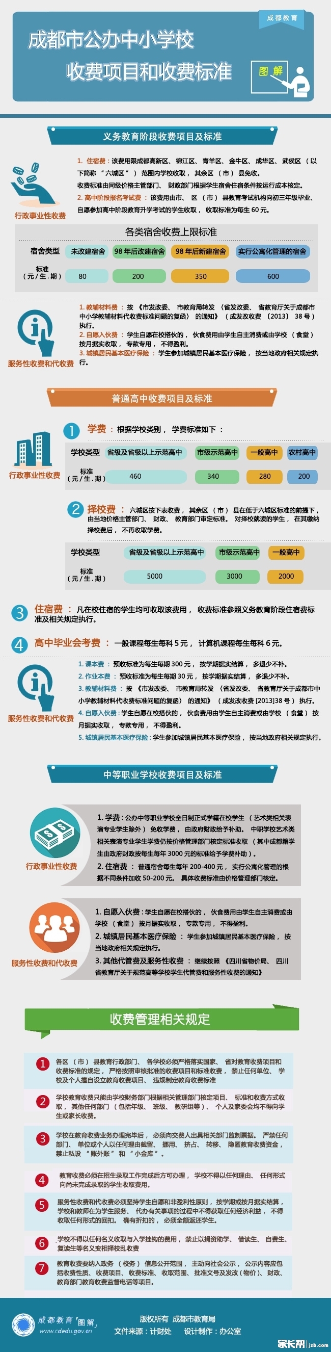 2016年成都小升初考生们,现在都已经确定了初中学校,目前成都大部分初中的新初一入学报到也几乎结束了,各初中学校的新初一收费项目和收费标准成了家长们关注的重点,那么下面就来看看成都公办初中2016年收费的情况吧。