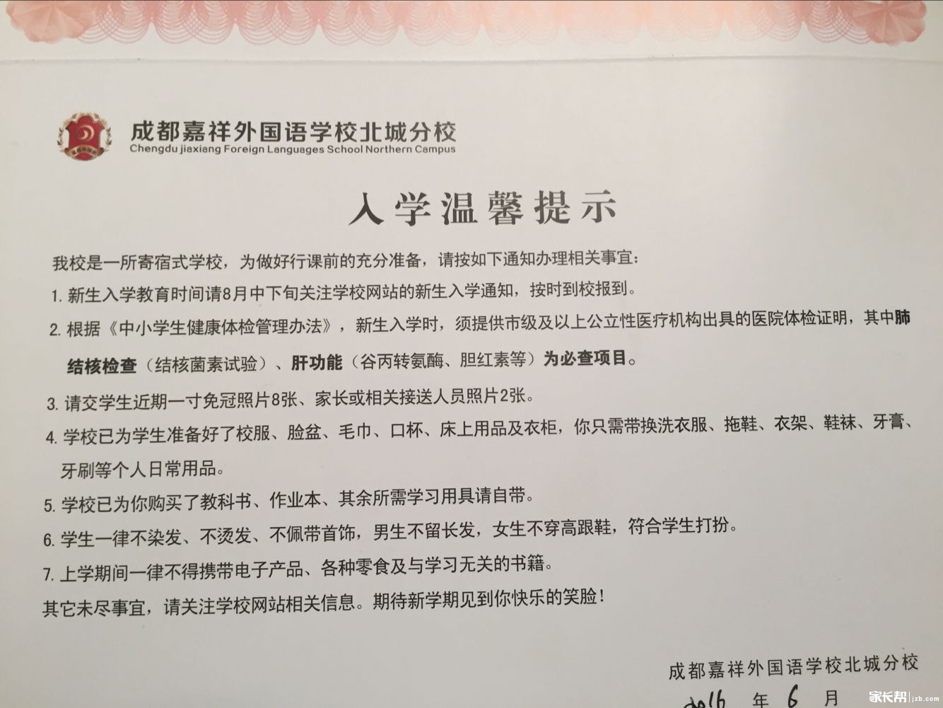 成都嘉祥外国语学校北城分校2016年初一新生将于8月30日入学报到,下面是成都嘉祥北城分校发布的2016成都小升初新生初一入学温馨提示,供参考。
