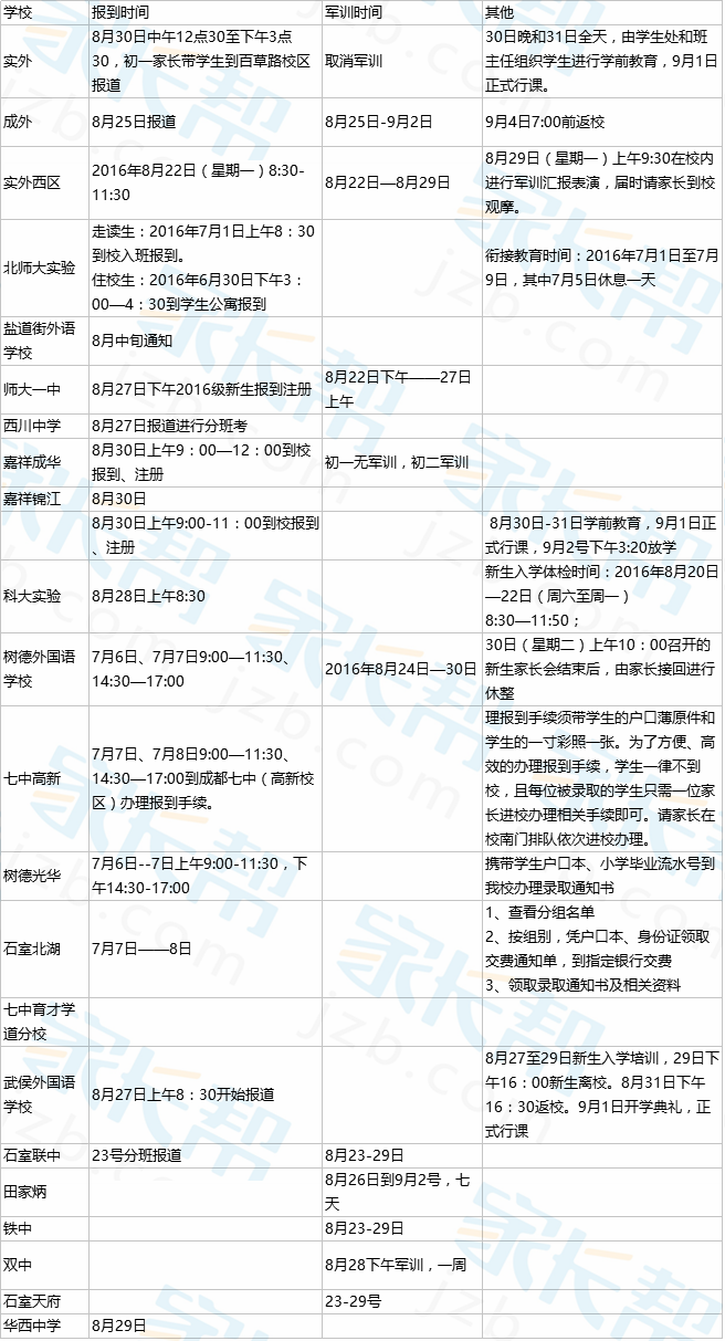 2016年成都新初一们的入学报到开始了,由于今年成都的高温天气,有的学校直接取消了2016级新初一军训,如实外;有的学校军训活动如期开营,如师大一中。由于各初中学校的军训活动可能发生变动,小编重新整理了成都各初中学校目前的新初一军训安排,供参考。