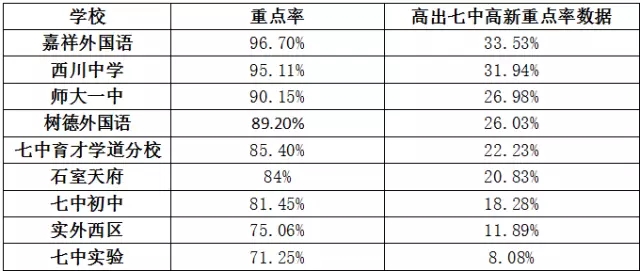 七中高新的重点率为63.17%,重点率高于它的学校就多了,除去没公布具体重点率的学校,七中实验、实外西区、七中初中、石室天府、七中育才学道分校、师大一中、西川中学和嘉祥外国语都遥遥领先。