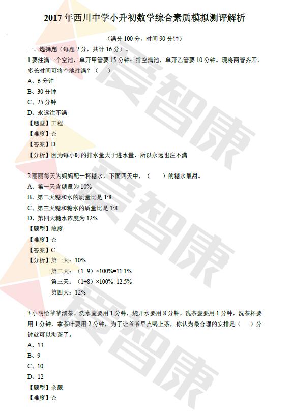 成都西川中学小升初模拟考数学试卷及答案(3)