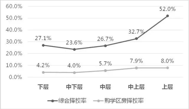 但中国教育追踪调查(CEPS)的结果显示,社会阶层与择校率之间呈现为“对勾”形关系。主观自我认定所属的社会阶层为下层的父母们的综合择校率为27.1%,比中下层的23.6%和中层的26.7%都要高,而中上层为32.7%,上层则高达52.0%。