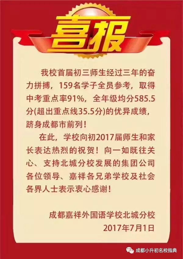 今日备受关注的成都2017年中考成绩火热出炉,我校首届初三师生经过三年的奋力拼搏,取得中考重点率91%,全年级均分585.5分!(超出重点线35.5分)的优异成绩!再次体现出嘉祥教育办学理念的成功!