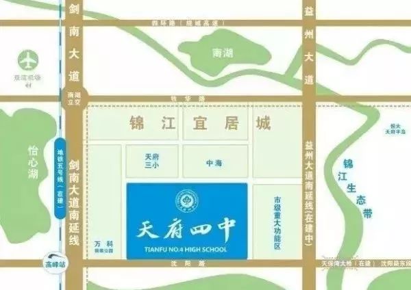 学校临近南湖公园,位于沈阳路上,紧靠剑南大道,旁边就是万科翡翠城。目前学校附近正在修建地铁5号线,预计于2019年正式开通。学校离华阳城区比较近,周围的配套设施也在轰轰烈烈的建设中。