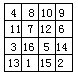 7.在下图的空格中填入不大于15且互不相同的自然数,使每一横行,每一竖列及每条对角线上三个数的和都等于30。