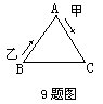 9.如图,等边三角形ABC的边长为100米,甲自A点,乙自B点同时出发,按顺时针方向沿着三角形的边行进。甲每分钟走60米,乙每分钟走90米,在过每个顶点时各人都因转弯而耽误10秒钟,那么乙在出发______秒之后追上甲。