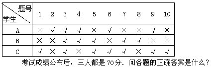 4.A、B、C三名同学参加了一次标准化考试,试题共10道,都是正误题,每道题10分,满分为100分。正确的画“√”,错误的画“×”。他们的答卷如下表: