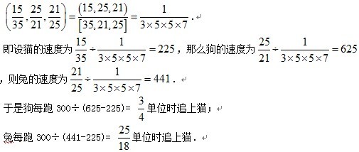 所以猫、狗、兔的速度比为15/35:25/21:21/25,它们的最大公约数为
