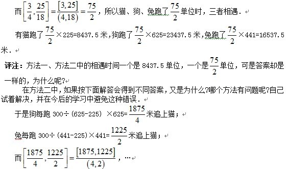 方法二:有猫跑35步的路程与狗跑21步的路程,兔跑25步的路程相;而猫跑15步的时间与狗跑25步的时间,兔跑21步的时间相同。