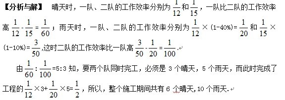 5.甲、乙两项工程分别由一、二队来完成。在晴天,一队完成甲工程需要12天。二队完成乙工程需要15天;在雨天,一队的工作效率要下降40%,二队的工作效率要下降10%。结果两队同时完成这两项工程,那么在施工的日子里,雨天有多少天?