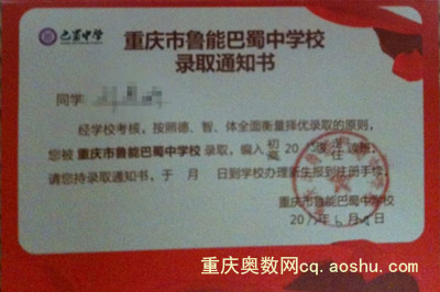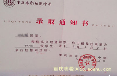 重庆奥数网7月10日:重庆重点中学2012小升初招生工作已基本结束,部分同学已拿到了自己心仪学校的录取通知书,这里是重庆南开中学、重庆一外、重庆巴蜀中学小升初的录取通知书及相关信息,重庆2013小升初的学生和家长们可以了解一下。(相关阅读:)