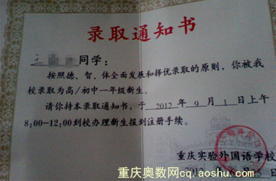 三、重庆一外2012小升初录取通知书