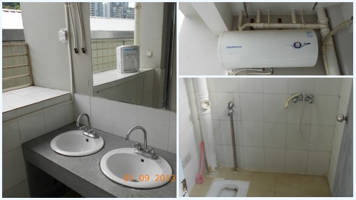 男生寝室,六人间,空调、热水器、独立卫生间。整体看上去宿舍活动空间还是比较大的,干净整洁。宿舍内布局是靠门处为柜子,然后是上下铺的床位,另一边为上床下桌,下桌共两个,各配有三个凳子,在桌上有书橱,可以放书。在上下铺的下铺下面有柜子,可能是放鞋子之类。