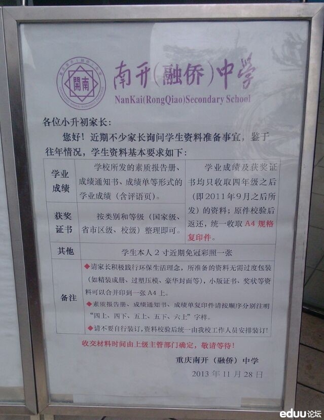 重庆南开中学融侨校区2014小升初咨询及资料告示