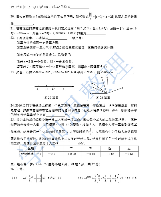 南开中学2016年初一数学上册期末考试试卷