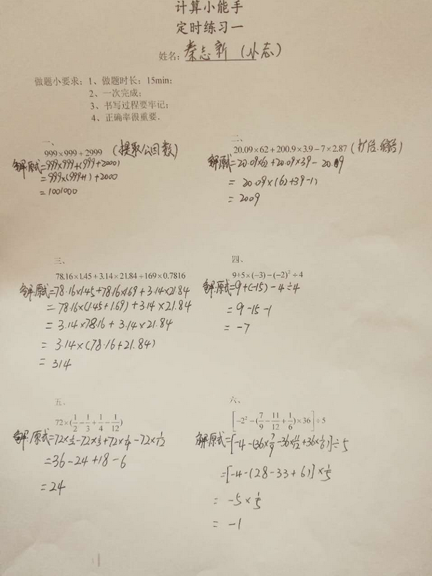 2017重庆新初一计算大赛每周一练答案(第一周)