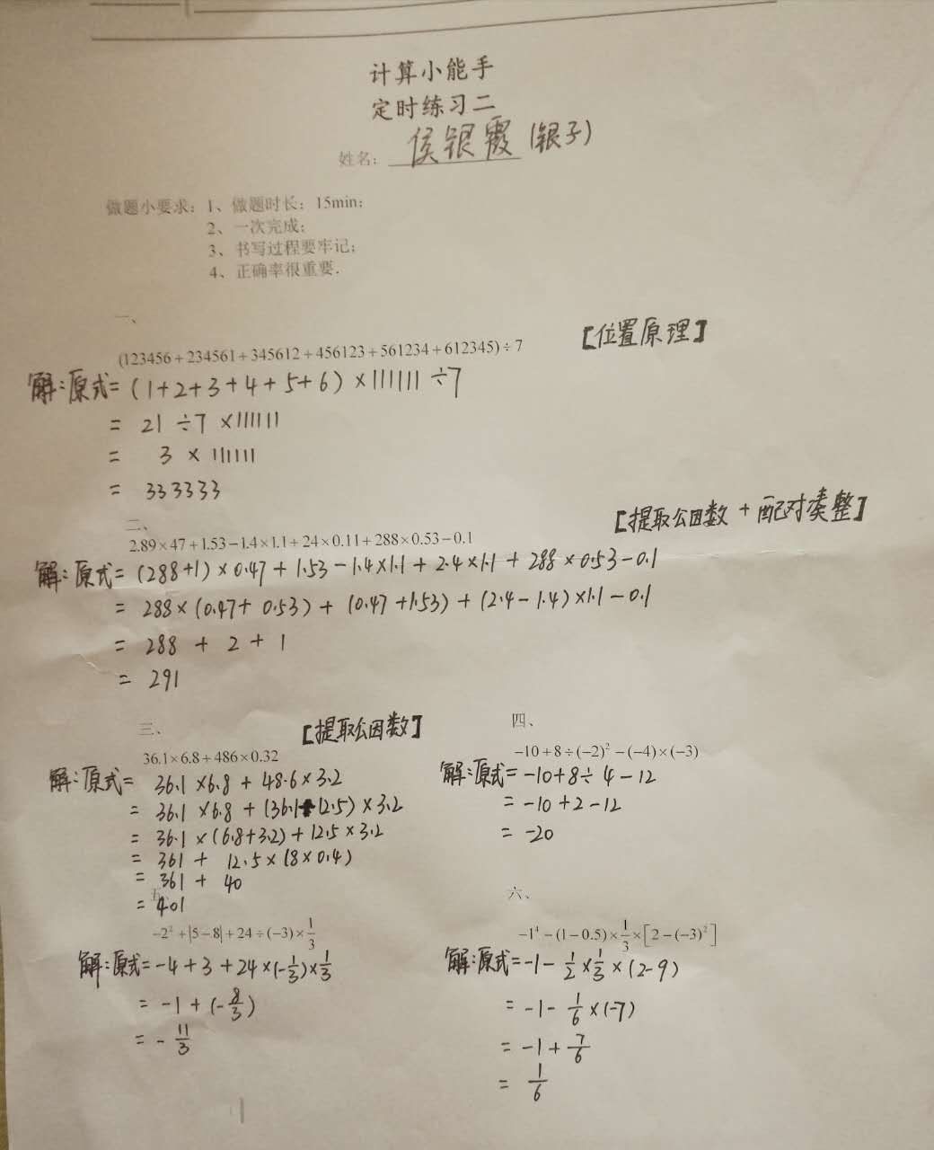 2017重庆新初一计算大赛每周一练答案(第二周)