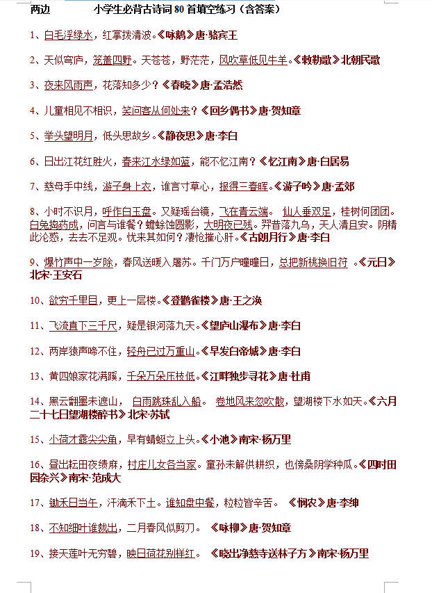 小学生必背古诗词80首填空练习