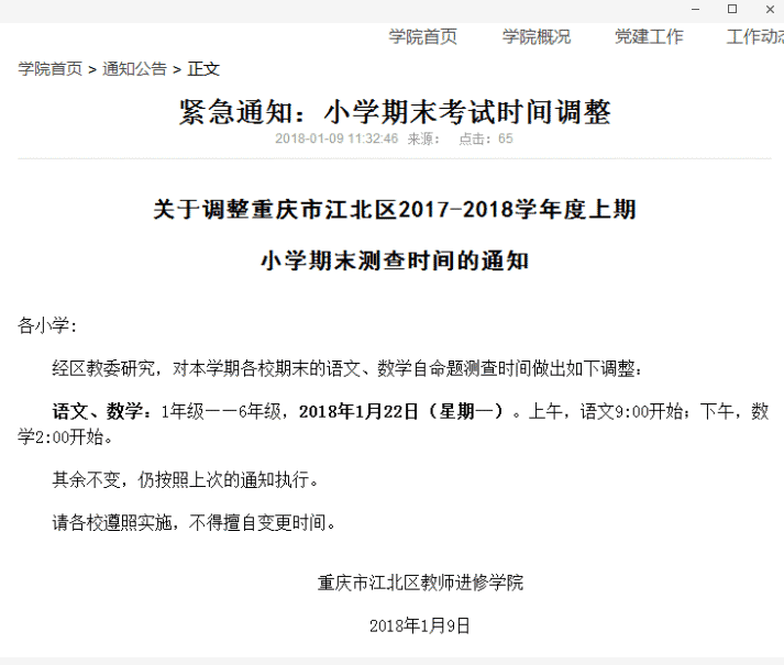 2018重庆江北区期末考试时间延后到1月22日 重庆家长帮 2018-01-10 10:40:01 江北区原定于1月18日的期末考试时间延后到了1月22日,此前,九龙坡区和大渡口区也将期末考试时间延后到了1月24日。