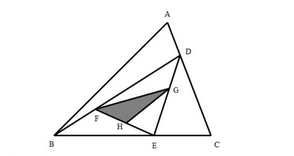 如图,三角形ABC面积为36平方厘米,并且AC=4AD,BE=3EC,BD=3BF,DE=3DG,H是EF的中点,求阴影部分三角形FGH的面积。