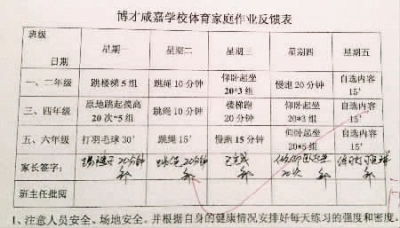 体育家庭作业是否会作为硬指标纳入学生成绩考核?博才咸嘉学校校长陈艳萍表示,班主任签字只是作为一种监督形式,如果哪个学生没完成,会要求他(她)在校内课间时间补上,并不会加重学生的负担。