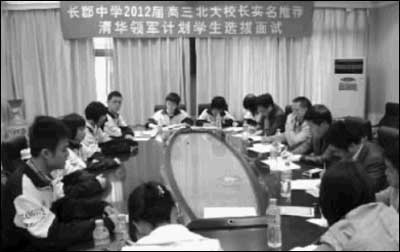 长沙市长郡中学举行2012届北大校长实名推荐和清华领军计划学生选拔面试。按照程序,长郡中学文科前20名、理科前30名者有资格自荐报名, 经过高三全体学生投票,至少50%得票率者进入下一轮角逐,再经过高三全体老师投票通过后的9名学生最终获得角逐上北大、清华的资格。面试分数占30%,文化成绩占70%。