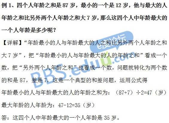 在年龄问题里面,如果既出现某两个或者多个人的年龄和,同时出现某两个人的年龄差,我们可以根据题目将其转化为和差问题,再运用和差问题的公式求解。