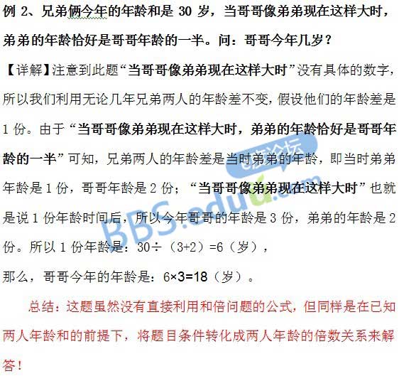 在年龄问题里面,如果既出现某两个或者多个人的年龄和,同时出现某两个人的年龄的倍数关系,我们可以根据题目将其转化为和倍问题,再运用和倍问题的公式求解。