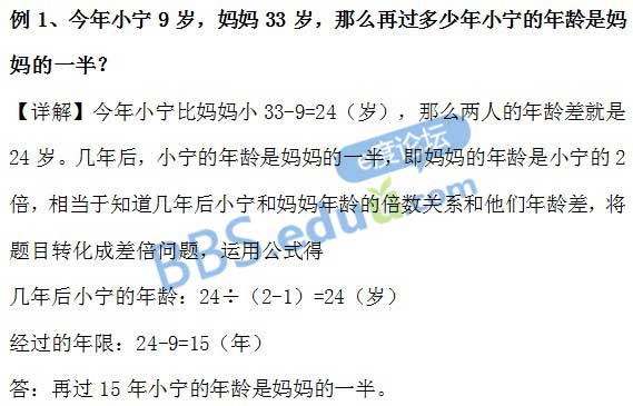 在年龄问题里面,如果能求出某两个人年龄差,同时出现某两个人的年龄的倍数关系,我们可以根据题目将其转化为差倍问题,再运用差倍问题的公式求解。