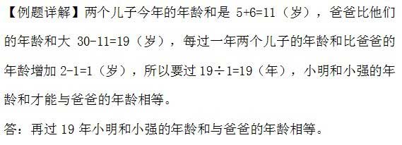 例1、爸爸今年20岁,儿子小明和小强分别是5岁和6岁,再过几年小明和小强的年龄和与爸爸的年龄相等?