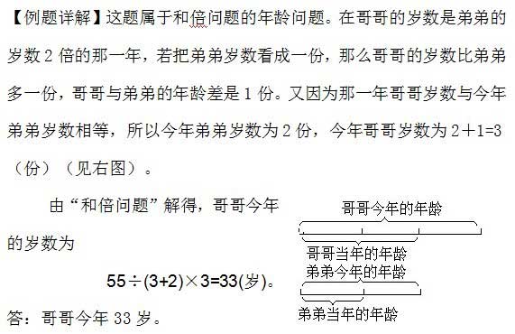 例2、今年兄弟二人年龄之和为55岁,哥哥某一年的岁数与弟弟今年的岁数相同,那一年哥哥的岁数恰好是弟弟岁数的2倍,请问哥哥今年多少岁?