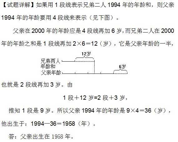 例3、1994年父亲的年龄是哥哥和弟弟年龄之和的4倍。2000年,父亲的年龄是哥哥和弟弟年龄之和的2倍。问:父亲出生在哪一年?