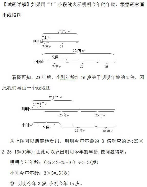 例4、今年小刚的年龄是明明年龄的5倍,25年后, 小刚的年龄比明明的年龄的2倍少16岁,今年小刚、明明各多少岁?