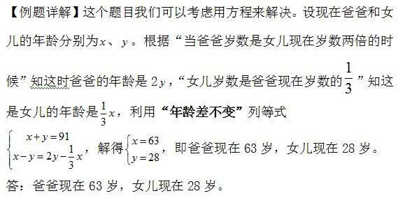 例5、爸爸和女儿两人岁数加起来是91岁,当爸爸岁数是女儿现在岁数两倍的时候,女儿岁数是爸爸现在岁数的