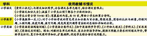据调查发现,从年级来看,基础年级的学生多选择“同步辅导类教辅书”,而毕业班年级的学生多选择“应试类教辅书”。其中,小学四年级的学生多选择《黄冈小状元》、《教材全解》、《课课练》、《双基练习》等,小学五年级的学生多选择《教材全解》、《教材同步辅 导》、《黄冈小状元》等。学生购买的教辅书一般由学校老师指定购买,每科所用资料1~2本。