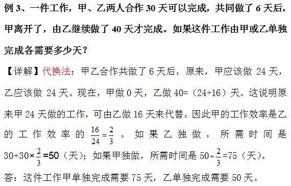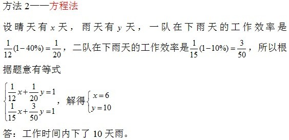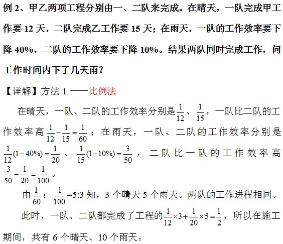 方程法是所有应用题的通法,这里用的是二元一次方程;比例法在分数应用题里面用的比较多,特别是像这样的例题,已知条件给出了两种不同情况下两队的效率,所以可以用比例法来做。