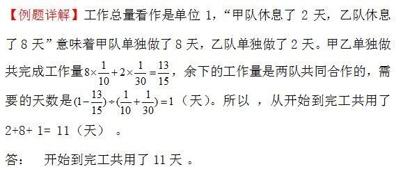 例1、一件工程,甲队单独做10天完成,乙队单独做30天完成.现在两队合作,其间甲队休息了2天,乙队休息了8天(不存在两队同一天休息)。问开始到完工共用了多少天时间?